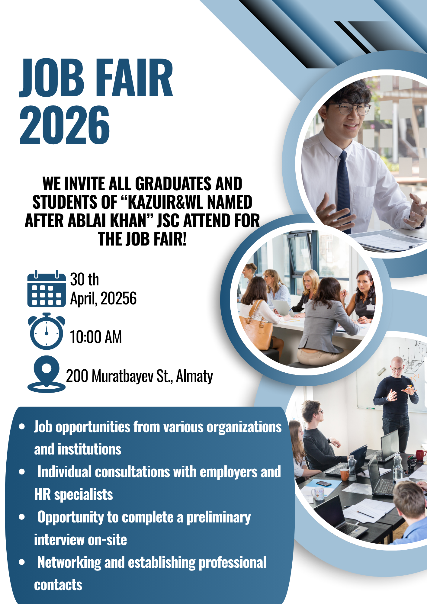 JOB FAIR 2026 Posted in Announcements We invite all graduates and students of «Ablai Khan KazUIR&WL» JSC to attend the Job Fair! Date: 30.04.2026 Time: 10:00 АМ Address: 200 Muratbayev St., Almaty Print Email