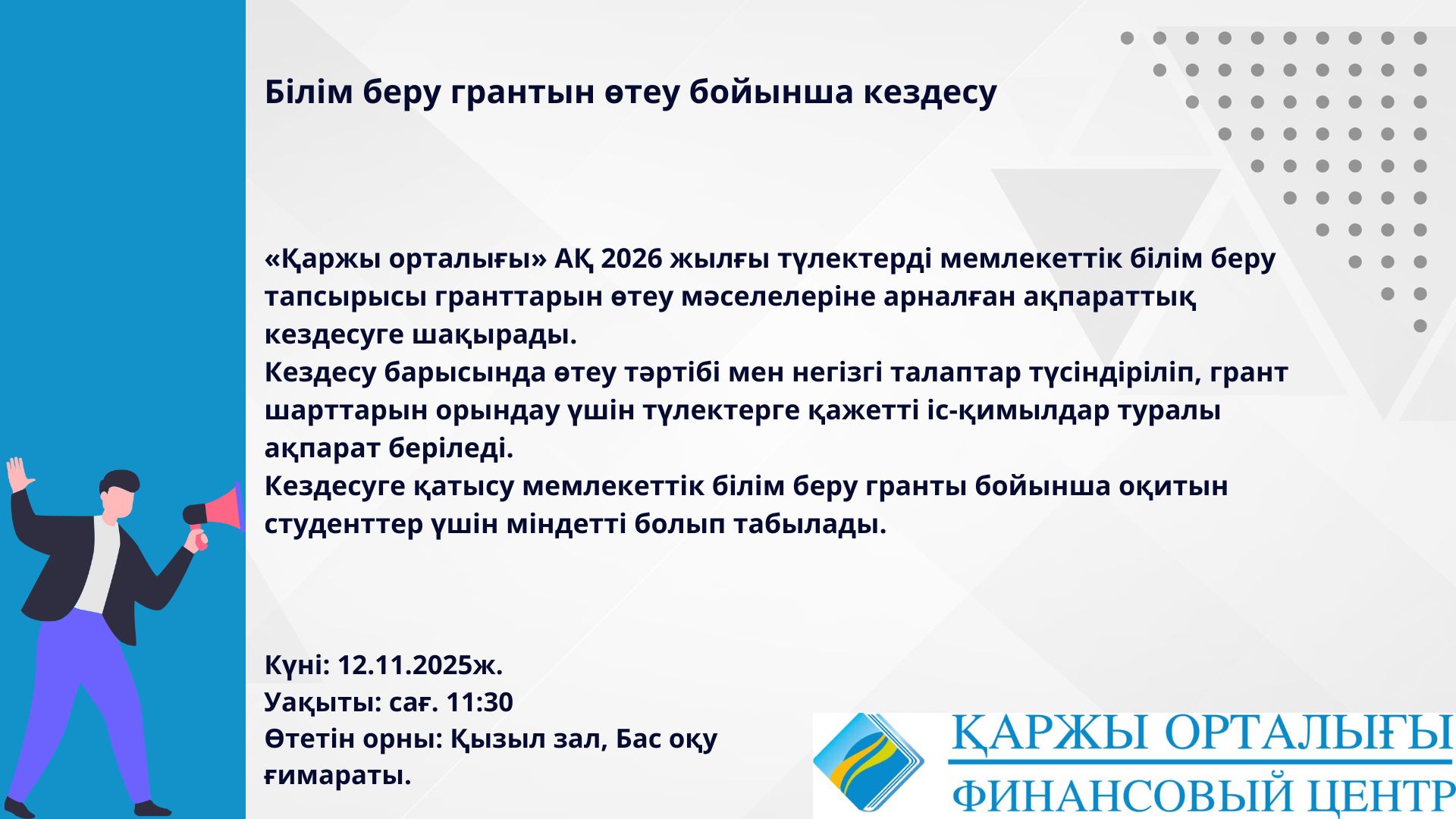 «Қаржы орталығы» АҚ 2026 жылғы түлектерді мемлекеттік білім беру тапсырысы гранттарын өтеу мәселелеріне арналған ақпараттық кездесуге шақырады.