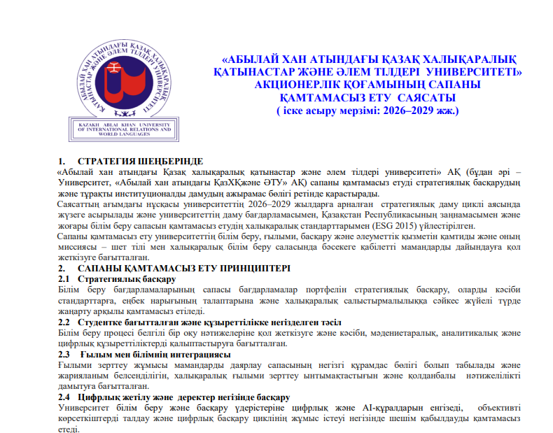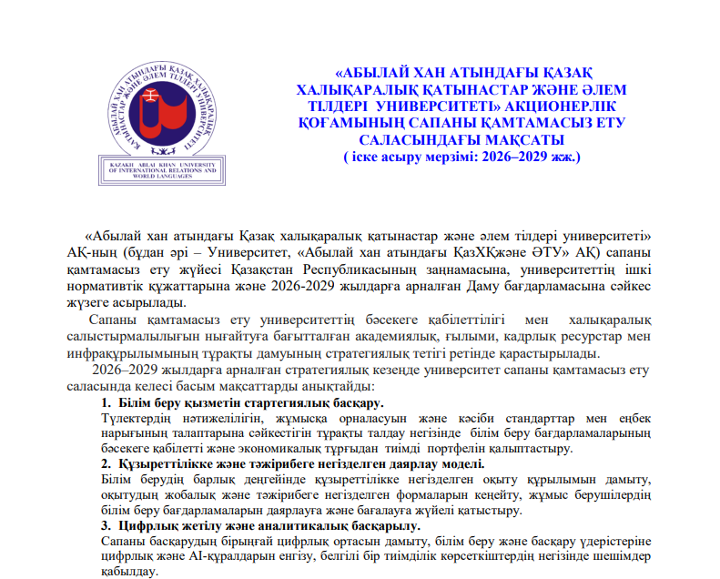 ҚР даму стратегиясын іске асыруда көпвекторлы халықаралық өзара іс-қимылды қамтамасыз ету үшін бәсекеге қабілетті жоғары білікті мамандарды даярлауды қамтамасыз ететін бірыңғай ғылыми-білім беру кешені ретінде халықаралық-бейімделгіш типтегі заманауи инновациялық-бағдарланған университетті құру.