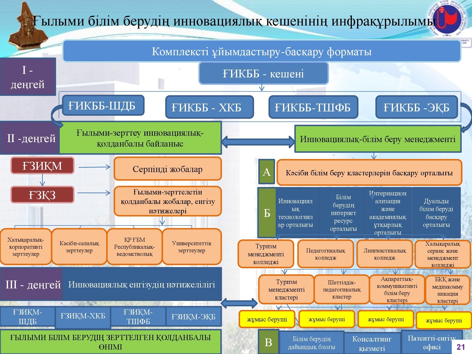 Төрт ғылыми-инновациялық кәсіби-білім беру кешені (ҒИКБК) форматындағы университеттің қалыптасқан бірыңғай ғылыми-инновациялық кәсіби-салалық білім беру құрылымы жоғары оқу орнын басқару мен дамытудың тік кластерлік тетігінің негізін қалады: