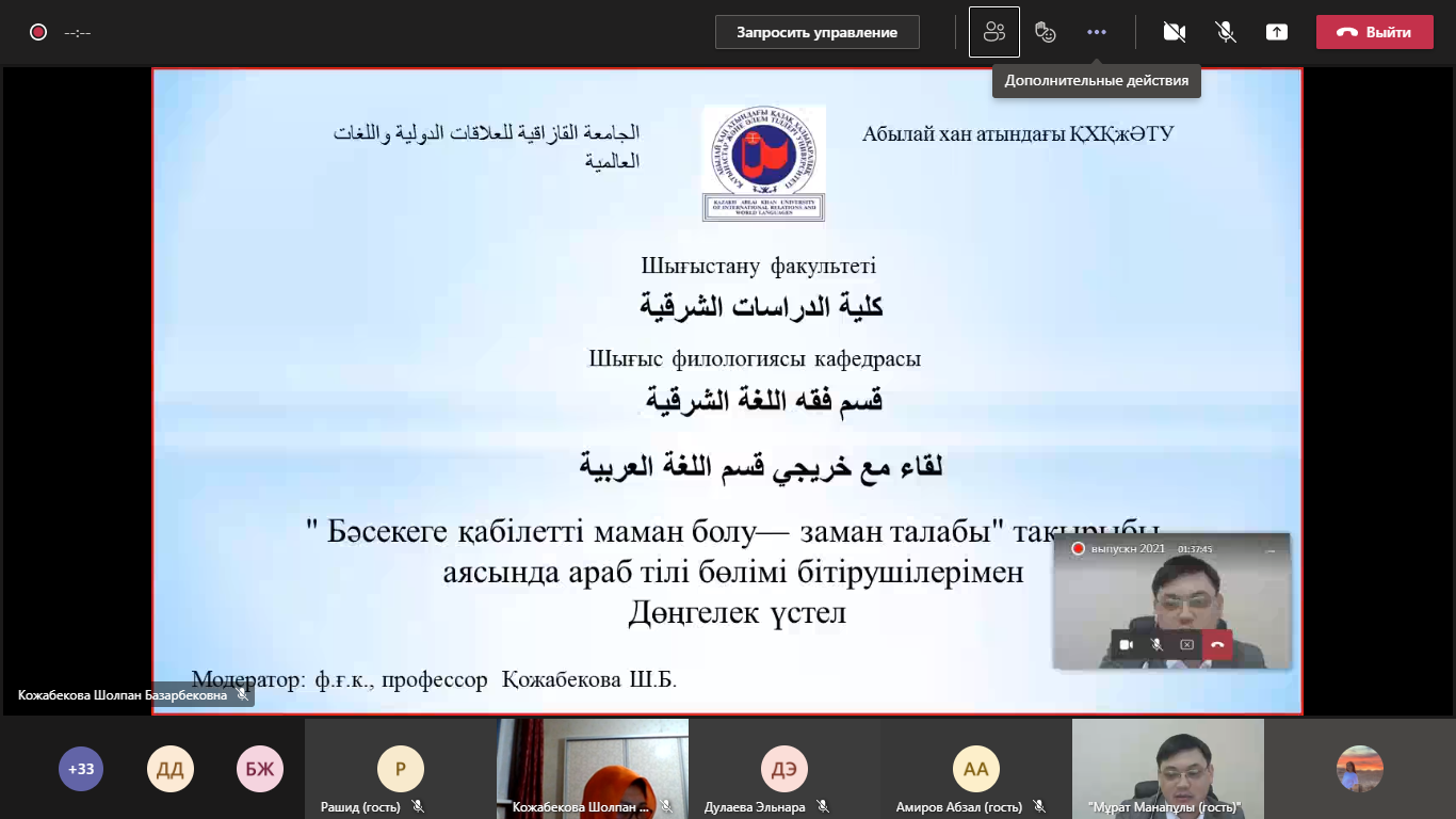 Благодарим модератора профессора Кожабекову Ш.Б., выпускников арабского отделения факультета Востоковедения, наших студентов и других гостей круглого стола.