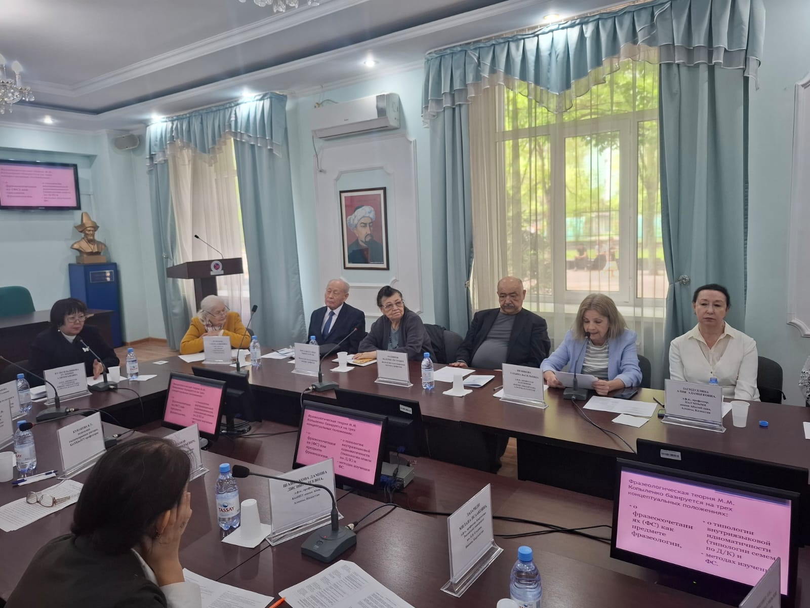 Присутствовашие ветераны университета к.пс.н. Кузнецова Тамара Даниловна, д.ф.н., профессор Рсалды Кусайын Тынысбаевич, Зульжамал Нургазиевна Даленова,  д.ф.н., профессор Махпиров Велинур Уйгурович поделились своими воспоминаниями о научных интересах ученых старшего поколения, которые создали подлинно академическую среду, где шел интенсивный обмен научными идеями. На Международный Круглый стол были  представлены доклады ученых-преподавателей, докторантов, магистрантов из разных вузов Казахстана.   В организации Круглого стола приняла активное участие Кафедра  лингвистики и информационно-коммуникационных технологий под руководством заведующей кафедрой д.ф.н., профессора Баяндиной Сауле Жумажановны.